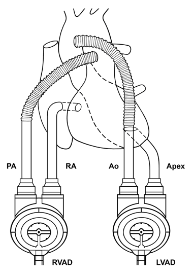 Neben «kausalen» chirurgischen Therapien (z.B. AC-Bypass-Operationen bei Koronarer Herzkrankheit, rekonstruktive Mitral- und Trikuspidalklappenchirurgie bei Valvulopathien) sind verschiedene mechanische Kreislaufunterstützungssysteme, sogenannte Assist Devices erhältlich. Grundsätzlich kommen 2 Typen zum Einsatz (Abbildungen 2 und 3).
